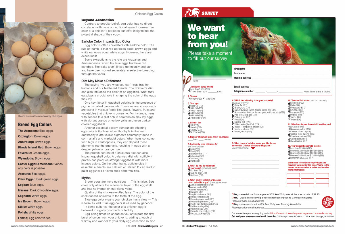 For immediate processing, log on to https:// www. chickenwhisperermagazine. com / reader-survey Cut out your answers and mail them to: CW Magazine • PO Box 1115 • Fort Dodge, IA 50501